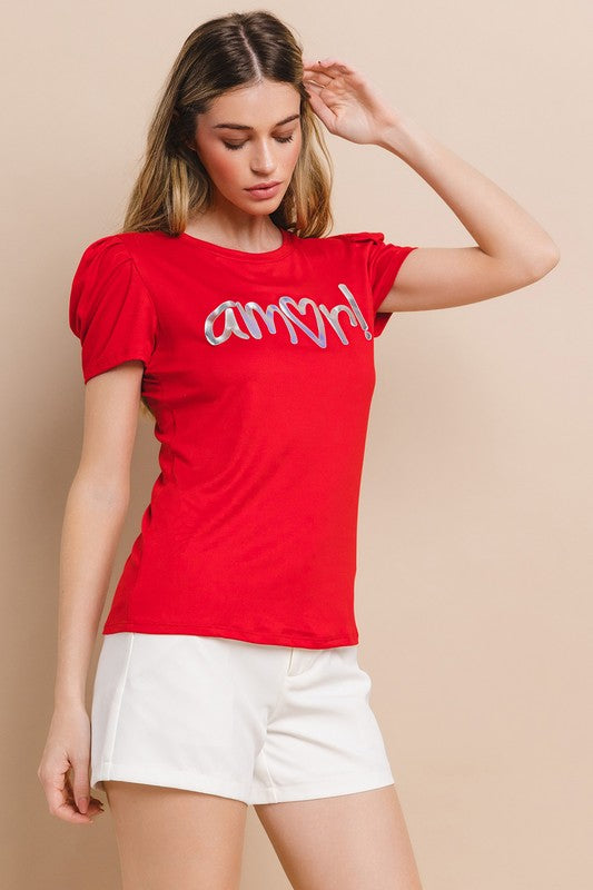 Beautiful foil metallic print puff shoulder top