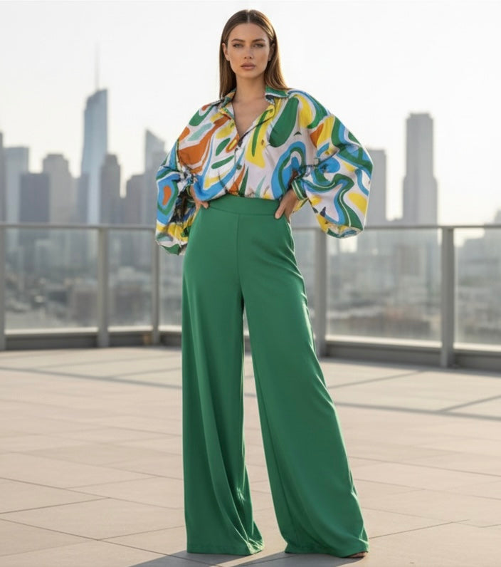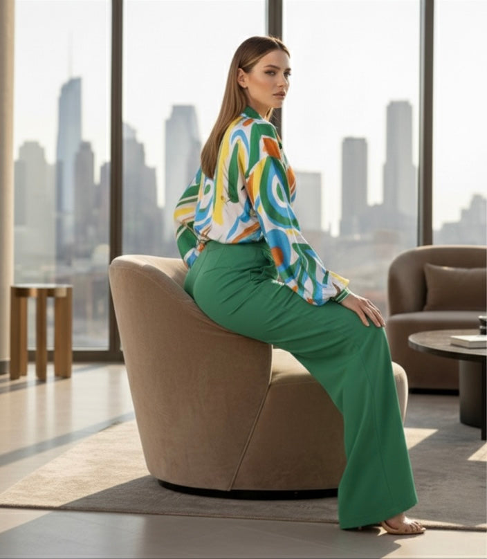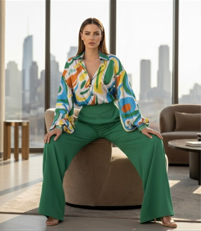 - Elegant SET. Yellow multi color print long sleeve button down blouse and Kelly Green wide leg pants with elastic waist, side zipper and pockets.